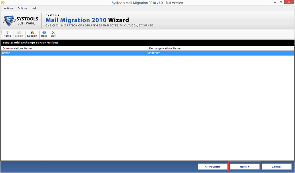 Step 7 - 11 : Provide the Exchange Mailbox name in which you want to migrate Domino Mailbox file and click on Next.
