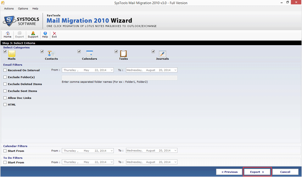 Step 8 - 11 : Select the criteria to migrate only required data like Mails, Contacts, Calendars, Task and Journals. Also you can use filter option like Calendar Filter and To Do Filter and click on Export button.